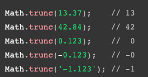 4) Math.trunc( ) - 주어진 값의 소수부분을 제거하고 숫자의 정수부분을 반환한다.