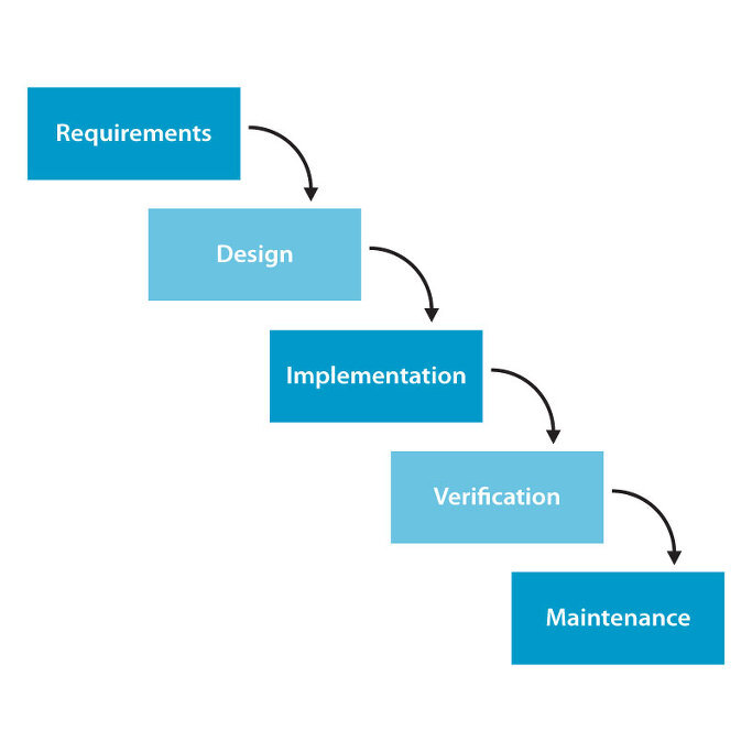 요구 사항 정의 후 설계, 개발, 테스트, 유지보수 등의 단계를 차례로 진행.