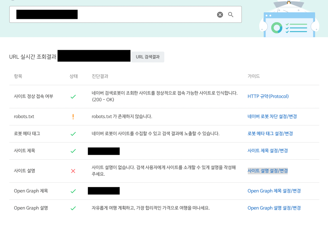 이거 제대로 작성안해서 네이버 검색엔진에서 빠꾸당한 기억이... og:description 만 적고 아 설명 적었지 하면서 name: description은 안적은 것이다. 그래도 바로 체크해서 반영했다. (바보같았던 그날...)