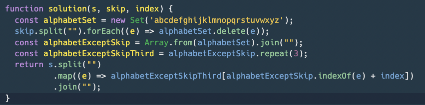 두 문자열 s와 skip, 그리고 자연수 index가 매개변수로 주어질 때 위 규칙대로 s를 변환한 결과를 return하도록 solution 함수를 완성해주세요.